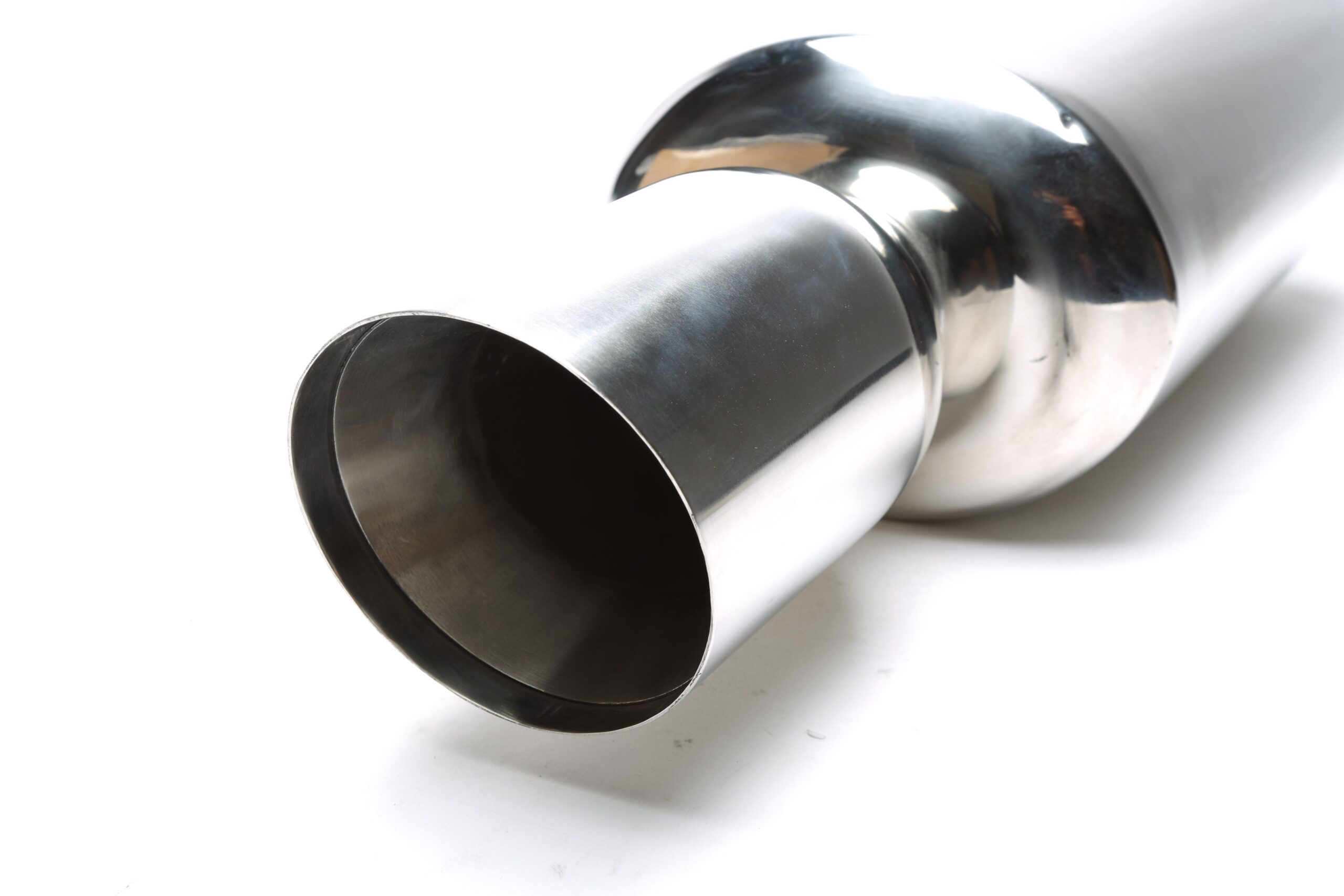 Edelstahl Sportendschalldämpfer universal 115mm rund / scharf / angeschrägt hochglanzpolierter Edelstahl Universell verwendbar Anschluss: 63,5mm Aussendurchmesser Endrohr: 115mm Innendurchmesser Endrohr: 110 auf 80mm Abmaße in mm (Länge / Breite / Höhe): 607 x 200 x 160mm Durchgangsrohr mit Absorber