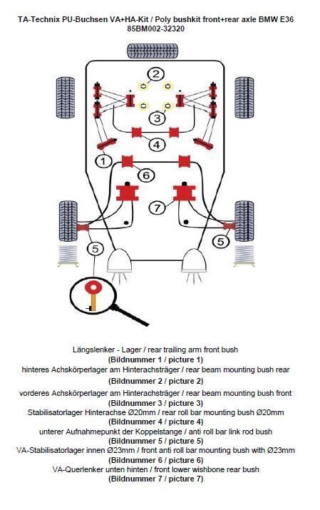PU-Buchsen Kit 38-teilig Vorder / - Hinterachse VA Stabilisator Ø 23mm HA Stabilisator Ø 20mm passend für BMW 3er Serie E36 (3C,3B,3/C,3/B) Coupe / Limousine / Touring / Cabriolet inkl. Modelle mit M Sportpaket beinhaltet: Längslenker - Lager ersetzt das serienmäßige Gummi / - Metalllager (Bildnummer 1) hinteres Achskörperlager am Hinterachsträger ersetzt das serienmäßige Gummi / - Metalllager (Bildnummer 2) vorderes Achskörperlager am Hinterachsträger ersetzt das serienmäßige Gummi / - Metalllager (Bildnummer 3) Stabilisatorlager Hinterachse Modelle mit Ø20mm am Stablisator (Bildnummer 4) Lagerung der Koppelstange am Stabilisator ersetzt das serienmäßige Gummi / Metallager in der Koppelstange / Pendelstütze (Bildnummer 5) VA-Stabilisatorlager innen Modelle mit Ø 23mm (Bildnummer 6) VA-Querlenker - Aufnahmepunkt hinten ersetzt das serienmäßige Gummi / Metalllager (Bildnummer 7)