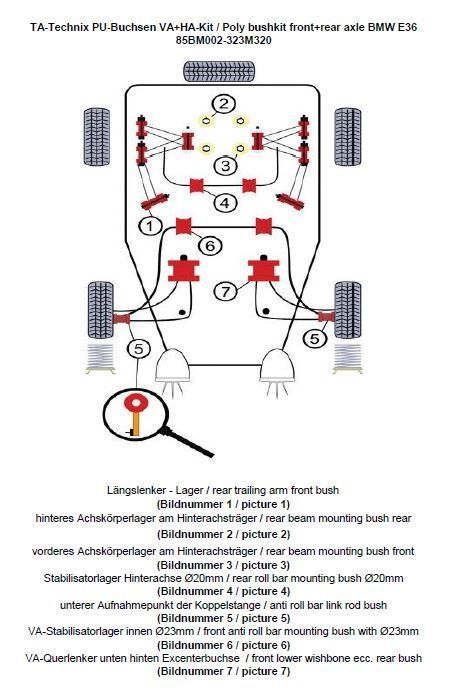 PU-Buchsen Kit 38-teilig Vorder / - Hinterachse VA Stabilisator Ø 23mm Satz Lager exzentrisch geformt (Bild 7) HA Stabilisator Ø 20mm passend für BMW 3er Serie E36 (3C,3B,3/C,3/B) Coupe / Limousine / Touring / Cabriolet inkl. Modelle mit M Sportpaket beinhaltet: Längslenker - Lager ersetzt das serienmäßige Gummi / - Metalllager (Bildnummer 1) hinteres Achskörperlager am Hinterachsträger ersetzt das serienmäßige Gummi / - Metalllager (Bildnummer 2) vorderes Achskörperlager am Hinterachsträger ersetzt das serienmäßige Gummi / - Metalllager (Bildnummer 3) Stabilisatorlager Hinterachse Modelle mit Ø 20mm am Stablisator (Bildnummer 4) Lagerung der Koppelstange am Stabilisator ersetzt das serienmäßige Gummi / Metallager in der Koppelstange / Pendelstütze (Bildnummer 5) VA-Stabilisatorlager innen Modelle mit Ø 23mm (Bildnummer 6) VA-Querlenker - Aufnahmepunkt hinten ersetzt das serienmäßige Gummi / Metalllager Satz Lager exzentrisch geformt (Bildnummer 7)