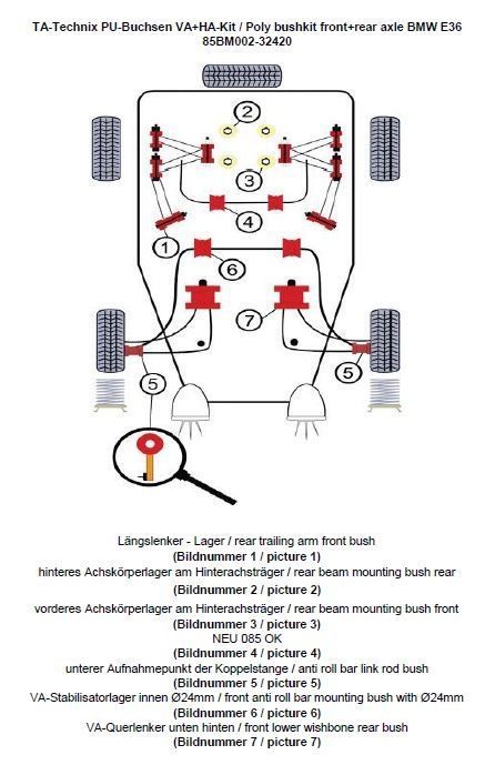 PU-Buchsen Kit 38-teilig Vorder / - Hinterachse VA Stabilisator Ø 24mm HA Stabilisator Ø 20mm passend für BMW 3er Serie E36 (3C,3B,3/C,3/B) Coupe / Limousine / Touring / Cabriolet inkl. Modelle mit M Sportpaket beinhaltet: Längslenker - Lager ersetzt das serienmäßige Gummi / - Metalllager (Bildnummer 1) hinteres Achskörperlager am Hinterachsträger ersetzt das serienmäßige Gummi / - Metalllager (Bildnummer 2) vorderes Achskörperlager am Hinterachsträger ersetzt das serienmäßige Gummi / - Metalllager (Bildnummer 3) Stabilisatorlager Hinterachse Modelle mit Ø20mm am Stablisator (Bildnummer 4) Lagerung der Koppelstange am Stabilisator ersetzt das serienmäßige Gummi / Metallager in der Koppelstange / Pendelstütze (Bildnummer 5) VA-Stabilisatorlager innen Modelle mit Ø 24mm (Bildnummer 6) VA-Querlenker - Aufnahmepunkt hinten ersetzt das serienmäßige Gummi / Metalllager (Bildnummer 7)