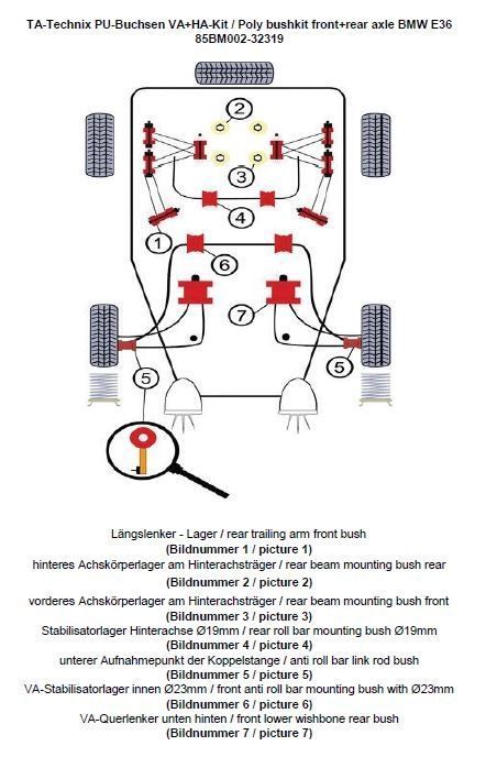 PU-Buchsen Kit 38-teilig Vorder / - Hinterachse VA Stabilisator Ø 23mm HA Stabilisator Ø 19mm passend für BMW 3er Serie E36 (3C,3B,3/C,3/B) Coupe / Limousine / Touring / Cabriolet inkl. Modelle mit M Sportpaket beinhaltet: Längslenker - Lager ersetzt das serienmäßige Gummi / - Metalllager (Bildnummer 1) hinteres Achskörperlager am Hinterachsträger ersetzt das serienmäßige Gummi / - Metalllager (Bildnummer 2) vorderes Achskörperlager am Hinterachsträger ersetzt das serienmäßige Gummi / - Metalllager (Bildnummer 3) Stabilisatorlager Hinterachse Modelle mit Ø19mm am Stablisator (Bildnummer 4) Lagerung der Koppelstange am Stabilisator ersetzt das serienmäßige Gummi / Metallager in der Koppelstange / Pendelstütze (Bildnummer 5) VA-Stabilisatorlager innen Modelle mit Ø 23mm (Bildnummer 6) VA-Querlenker - Aufnahmepunkt hinten ersetzt das serienmäßige Gummi / Metalllager (Bildnummer 7)
