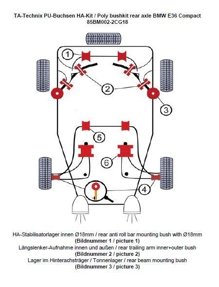 PU-Buchsen Kit Hinterachse 14-teilig Modelle mit Ø 18mm Stabilisator beinhaltet: Stabilisatorlager Hinterachse Modelle mit 18mm Ø am Stablisator (Bildnummer 1) Längslenker-Aufnahme innen und außen (Bildnummer 2) Lager im Hinterachsträger / Tonnenlager (Bildnummer 3) passend für BMW 3er Serie E36 Compact (3CG) BMW Z3 Roadster/Coupe (R/C)