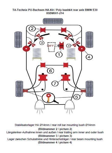 PU-Buchsen Kit Hinterachse 20-teilig Modelle mit Ø 14mm Stabilisator beinhaltet: Stabilisatorlager Hinterachse Modelle mit 14mm Ø am Stablisator (Bildnummer 2) Längslenker-Aufnahme innen und außen (Bildnummer 3) Austausch der Gummi / - Metalllager zwischen Schubstrebe und Hinterachsträger (Bildnummer 4) passend für BMW 3er Serie E30 Limousine (3/1) / Touring (3/1) / Cabriolet (3/R) ohne M3 und iX Modelle