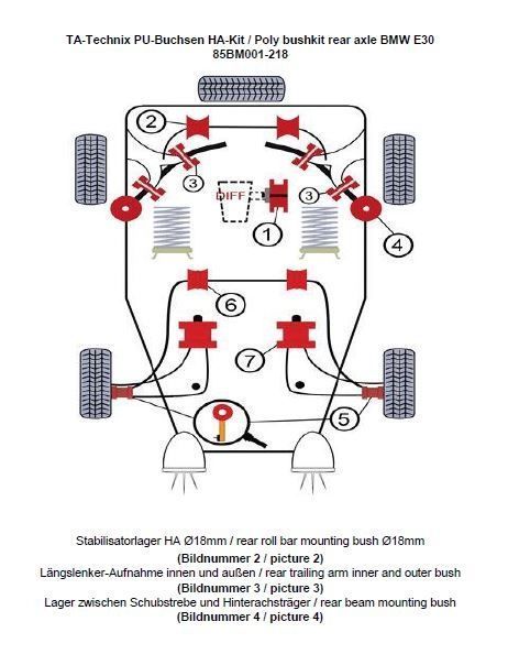 PU-Buchsen Kit Hinterachse 20-teilig Modelle mit Ø 18mm Stabilisator beinhaltet: Stabilisatorlager Hinterachse Modelle mit 18mm Ø am Stabilisator (Bildnummer 2) Längslenker-Aufnahme innen und außen (Bildnummer 3) Austausch der Gummi / - Metalllager zwischen Schubstrebe und Hinterachsträger (Bildnummer 4) passend für BMW 3er Serie E30 Limousine (3/1) / Touring (3/1) / Cabriolet (3/R) z. B. Modelle mit Sport Stabilisatoren die nachgerüstet wurden