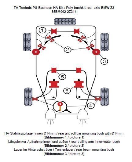 PU-Buchsen Kit Hinterachse 20-teilig Modelle mit Ø 14mm Stabilisator beinhaltet: Stabilisatorlager Hinterachse Modelle mit 14mm Ø am Stablisator (Bildnummer 1) Längslenker-Aufnahme innen und außen (Bildnummer 2) Lager im Hinterachsträger / Tonnenlager (Bildnummer 3) passend für BMW Z3 Roadster/Coupe Serie E36 (R/C)