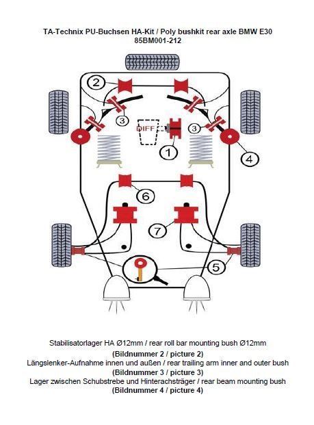 PU-Buchsen Kit Hinterachse 20-teilig Modelle mit Ø 12mm Stabilisator beinhaltet: Stabilisatorlager Hinterachse Modelle mit 12mm Ø am Stablisator (Bildnummer 2) Längslenker-Aufnahme innen und außen (Bildnummer 3) Austausch der Gummi / - Metalllager zwischen Schubstrebe und Hinterachsträger (Bildnummer 4) passend für BMW 3er Serie E30 Limousine (3/1) / Cabriolet (3/R) ohne M3 und iX Modelle