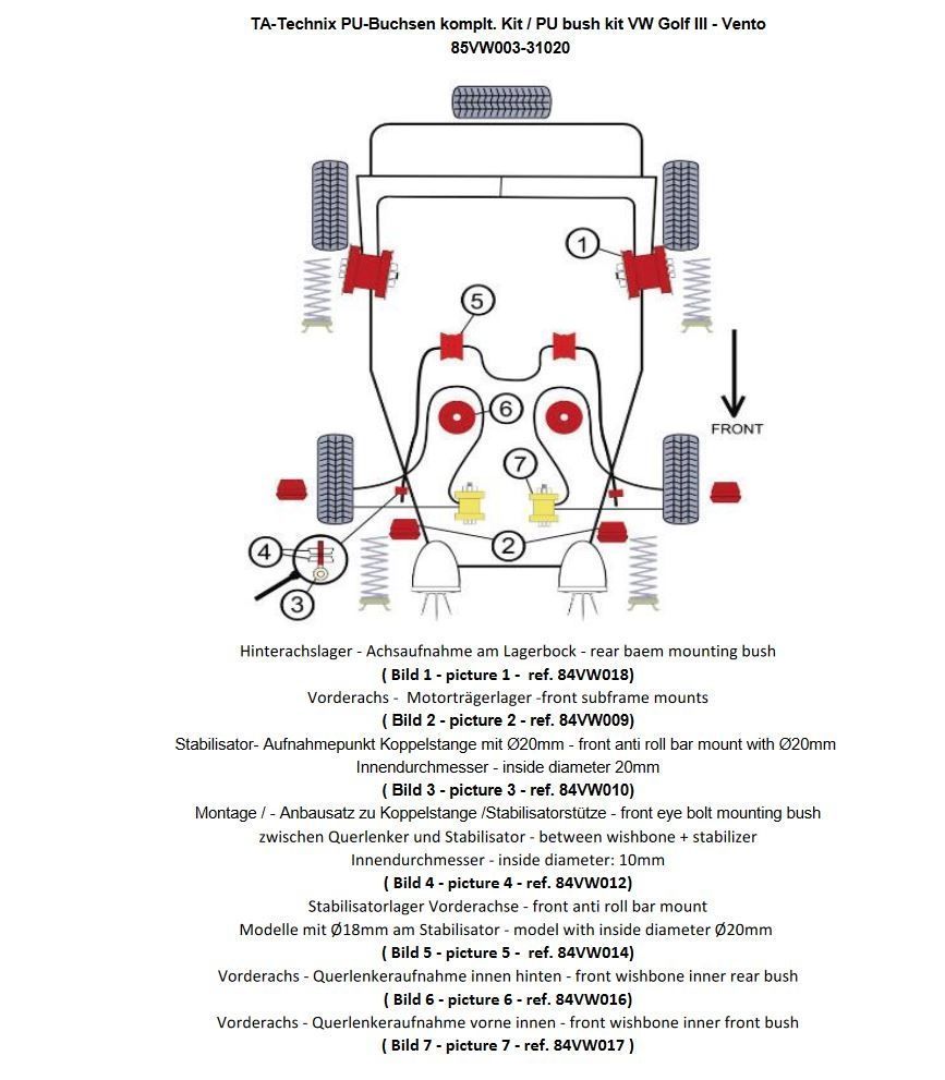 PU-Buchsen Kit Vorder- /Hinterachse 28-teilig beinhaltet: Hinterachslager - Achsaufnahme am Lagerbock ersetzt das serienmäßige Gummi - / Metallager ( Bildnummer 1) Vorderachs - Motorträgerlager ( Bildnummer 2) Vorderachs - Stabilisator außen - / Aufnahmepunkt an der Koppelstange ersetzt das serienmäßige Gummilager im oberen Teil der Koppelstange für Modelle mit Ø 20mm Stabilisator (Bildnummer 3) Montage - / Anbausatz zu Koppelstange /Stabilisatorstütze zwischen Querlenker und Stabilisator Innendurchmesser: 10mm (Bildnummer 4) Stabilisatorlager Vorderachse Modelle mit 20mm Ø am Stabilisator (Bildnummer 5) Vorderachs - Querlenkeraufnahme innen hinten ersetzt das serienmäßige Gummilager (Bildnummer 6) Vorderachs - Querlenkeraufnahme innen vorne ersetzt das serienmäßige Gummilager / - Metallager Modelle mit Stahlblech - Querlenker (Bildnummer 7) passend für VW Golf III (1H) / Golf III+IV Cabriolet (1H/1E) / Vento (1H) ohne VR6 / Syncro / Variant Modelle mit innen Ø 20mm Stabigummis Koppelstange mit Auge - / Stiftbefestigung mit innen Ø10mm