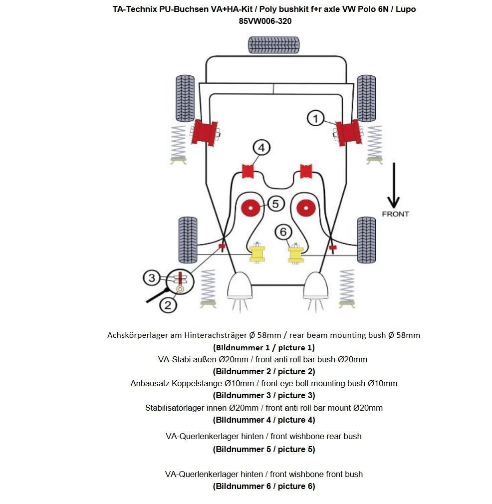 PU-Buchsen Kit Vorder-/Hinterachse 30-teilig Modelle mit Ø 20mm Vorderachse-Stabilisator Hinterachse-Achskörperlager Ø 58mm beinhaltet: Achskörperlager am Hinterachsträger Modelle mit Ø 58mm (Bildnummer 1) Vorderachs - Stabilisator außen / - Aufnahmepunkt an der Koppelstange ersetzt das serienmäßige Gummilager im oberen Teil der Koppelstange für Modelle mit Ø 20mm Stabilisator (Bildnummer 2) Montage / - Anbausatz zu Koppelstange /Stabilisatorstütze zwischen Querlenker und Stabilisator Innendurchmesser: 10mm (Bildnummer 3) Stabilisatorlager innen - Vorderachse Modelle mit Ø 20mm am Stabilisator (Bildnummer 4) Vorderachse - Querlenkerlager hinten / innen ersetzt das serienmäßige Gummi / - Metallager (Bildnummer 5) Vorderachse - Querlenkerlager vorne / innen ersetzt das serienmäßige Gummi / - Metallager (Bildnummer 6) passend für Seat Arosa (6H) VW Lupo (6X,6E) / Polo (6N1) ohne Lupo 1.2TDI 3L + Lupo 1.4l FSI Polo (6N1) bis Baujahr 10.1999
