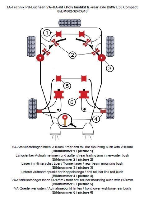 PU-Buchsen Kit Vorder- /Hinterachse 32-teilig Vorderachse Stabilisator Ø 24mm Hinterachse Stabilisator Ø 16mm beinhaltet: Stabilisatorlager Hinterachse Modelle mit 16mm Ø am Stablisator (Bildnummer 1) Längslenker-Aufnahme innen und außen (Bildnummer 2) Lager im Hinterachsträger / Tonnenlager (Bildnummer 3) Lagerung der Koppelstange am Stabilisator ersetzt das serienmäßige Gummi / Metallager in der Koppelstange / Pendelstütze (Bildnummer 4) Vorderachse-Stabilisatorlager innen Modelle mit Ø 24mm (Bildnummer 5) Vorderachse-Querlenker - Aufnahmepunkt hinten ersetzt das serienmäßige Gummi / Metalllager (Bildnummer 6) passend für BMW 3er Serie E36 Compact (3CG)