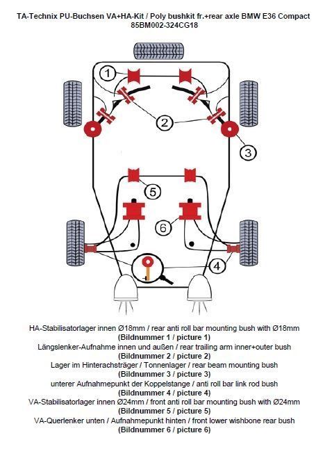 PU-Buchsen Kit Vorder- /Hinterachse 32-teilig Vorderachse Stabilisator Ø 24mm Hinterachse Stabilisator Ø 18mm beinhaltet: Stabilisatorlager Hinterachse Modelle mit 18mm Ø am Stablisator (Bildnummer 1) Längslenker-Aufnahme innen und außen (Bildnummer 2) Lager im Hinterachsträger / Tonnenlager (Bildnummer 3) Lagerung der Koppelstange am Stabilisator ersetzt das serienmäßige Gummi / Metallager in der Koppelstange / Pendelstütze (Bildnummer 4) Vorderachse-Stabilisatorlager innen Modelle mit Ø 24mm (Bildnummer 5) Vorderachse-Querlenker - Aufnahmepunkt hinten ersetzt das serienmäßige Gummi / Metalllager (Bildnummer 6) passend für BMW 3er Serie E36 Compact (3CG)