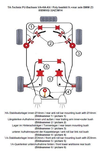 PU-Buchsen Kit Vorder- /Hinterachse 32-teilig Vorderachse Stabilisator Ø 24mm Hinterachse Stabilisator Ø 14mm beinhaltet: Stabilisatorlager Hinterachse Modelle mit 14mm Ø am Stablisator (Bildnummer 1) Längslenker-Aufnahme innen und außen (Bildnummer 2) Lager im Hinterachsträger / Tonnenlager (Bildnummer 3) Lagerung der Koppelstange am Stabilisator ersetzt das serienmäßige Gummi / Metallager in der Koppelstange / Pendelstütze (Bildnummer 4) Vorderachse-Stabilisatorlager innen Modelle mit Ø 24mm (Bildnummer 5) Vorderachse-Querlenker - Aufnahmepunkt hinten ersetzt das serienmäßige Gummi / Metalllager (Bildnummer 6) passend für BMW Z3 Roadster/Coupe Serie E36 (R/C) ohne M Modelle