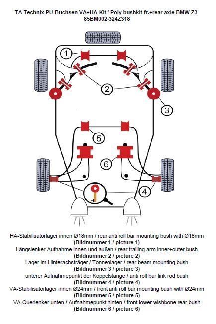 PU-Buchsen Kit Vorder- /Hinterachse 32-teilig Vorderachse Stabilisator Ø 24mm Hinterachse Stabilisator Ø 18mm beinhaltet: Stabilisatorlager Hinterachse Modelle mit 18mm Ø am Stablisator (Bildnummer 1) Längslenker-Aufnahme innen und außen (Bildnummer 2) Lager im Hinterachsträger / Tonnenlager (Bildnummer 3) Lagerung der Koppelstange am Stabilisator ersetzt das serienmäßige Gummi / Metallager in der Koppelstange / Pendelstütze (Bildnummer 4) Vorderachse-Stabilisatorlager innen Modelle mit Ø 24mm (Bildnummer 5) Vorderachse-Querlenker - Aufnahmepunkt hinten ersetzt das serienmäßige Gummi / Metalllager (Bildnummer 6) passend für BMW Z3 Roadster/Coupe Serie E36 (R/C) ohne M Modelle