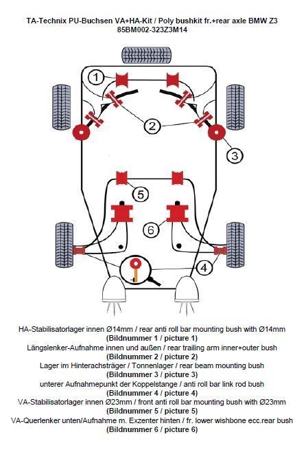 PU-Buchsen Kit Vorder- /Hinterachse 32-teilig Vorderachse Stabilisator Ø 24mm Satz Lager exzentrisch geformt (Bild 6) Hinterachse Stabilisator Ø 14mm beinhaltet: Stabilisatorlager Hinterachse Modelle mit 14mm Ø am Stablisator (Bildnummer 1) Längslenker-Aufnahme innen und außen (Bildnummer 2) Lager im Hinterachsträger / Tonnenlager (Bildnummer 3) Lagerung der Koppelstange am Stabilisator ersetzt das serienmäßige Gummi / Metallager in der Koppelstange / Pendelstütze (Bildnummer 4) Vorderachse-Stabilisatorlager innen Modelle mit Ø 24mm (Bildnummer 5) Vorderachse-Querlenker - Aufnahmepunkt hinten ersetzt das serienmäßige Gummi / Metalllager Satz Lager exzentrisch geformt (Bildnummer 6) passend für BMW Z3 Roadster/Coupe Serie E36 (R/C) ohne M Modelle