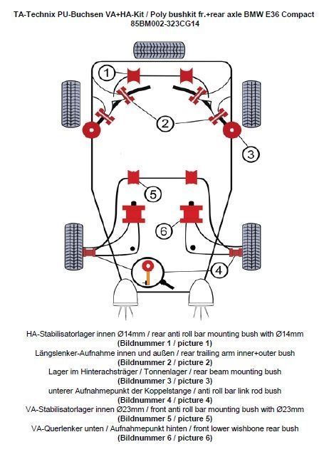 PU-Buchsen Kit Vorder- /Hinterachse 32-teilig Vorderachse Stabilisator Ø 23mm Hinterachse Stabilisator Ø 14mm beinhaltet: Stabilisatorlager Hinterachse Modelle mit 14mm Ø am Stablisator (Bildnummer 1) Längslenker-Aufnahme innen und außen (Bildnummer 2) Lager im Hinterachsträger / Tonnenlager (Bildnummer 3) Lagerung der Koppelstange am Stabilisator ersetzt das serienmäßige Gummi / Metallager in der Koppelstange / Pendelstütze (Bildnummer 4) Vorderachse-Stabilisatorlager innen Modelle mit Ø 23mm (Bildnummer 5) Vorderachse-Querlenker - Aufnahmepunkt hinten ersetzt das serienmäßige Gummi / Metalllager (Bildnummer 6) passend für BMW 3er Serie E36 Compact (3CG)
