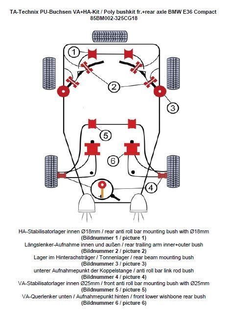 PU-Buchsen Kit Vorder- /Hinterachse 32-teilig Vorderachse Stabilisator Ø 25mm Hinterachse Stabilisator Ø 18mm beinhaltet: Stabilisatorlager Hinterachse Modelle mit 18mm Ø am Stablisator (Bildnummer 1) Längslenker-Aufnahme innen und außen (Bildnummer 2) Lager im Hinterachsträger / Tonnenlager (Bildnummer 3) Lagerung der Koppelstange am Stabilisator ersetzt das serienmäßige Gummi / Metallager in der Koppelstange / Pendelstütze (Bildnummer 4) Vorderachse-Stabilisatorlager innen Modelle mit Ø 25mm (Bildnummer 5) Vorderachse-Querlenker - Aufnahmepunkt hinten ersetzt das serienmäßige Gummi / Metalllager (Bildnummer 6) passend für BMW 3er Serie E36 Compact (3CG)