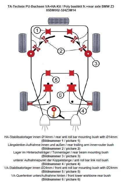 PU-Buchsen Kit Vorder- /Hinterachse 32-teilig Vorderachse Stabilisator Ø 25mm Hinterachse Stabilisator Ø 14mm beinhaltet: Stabilisatorlager Hinterachse Modelle mit 14mm Ø am Stablisator (Bildnummer 1) Längslenker-Aufnahme innen und außen (Bildnummer 2) Lager im Hinterachsträger / Tonnenlager (Bildnummer 3) Lagerung der Koppelstange am Stabilisator ersetzt das serienmäßige Gummi / Metallager in der Koppelstange / Pendelstütze (Bildnummer 4) Vorderachse-Stabilisatorlager innen Modelle mit Ø 25mm (Bildnummer 5) Vorderachse-Querlenker - Aufnahmepunkt hinten ersetzt das serienmäßige Gummi / Metalllager (Bildnummer 6) passend für BMW Z3 Roadster/Coupe Serie E36 (R/C) ohne M Modelle
