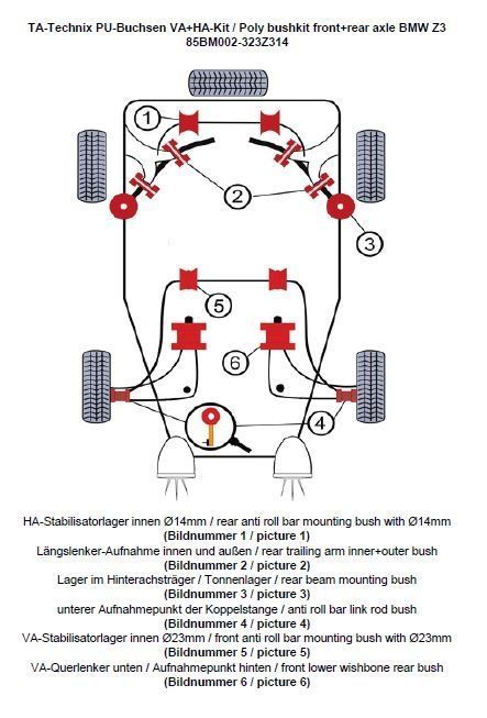PU-Buchsen Kit Vorder- /Hinterachse 32-teilig Vorderachse Stabilisator Ø 23mm Hinterachse Stabilisator Ø 14mm beinhaltet: Stabilisatorlager Hinterachse Modelle mit 14mm Ø am Stablisator (Bildnummer 1) Längslenker-Aufnahme innen und außen (Bildnummer 2) Lager im Hinterachsträger / Tonnenlager (Bildnummer 3) Lagerung der Koppelstange am Stabilisator ersetzt das serienmäßige Gummi / Metallager in der Koppelstange / Pendelstütze (Bildnummer 4) Vorderachse-Stabilisatorlager innen Modelle mit Ø 23mm (Bildnummer 5) Vorderachse-Querlenker - Aufnahmepunkt hinten ersetzt das serienmäßige Gummi / Metalllager (Bildnummer 6) passend für BMW Z3 Roadster/Coupe Serie E36 (R/C) ohne M Modelle