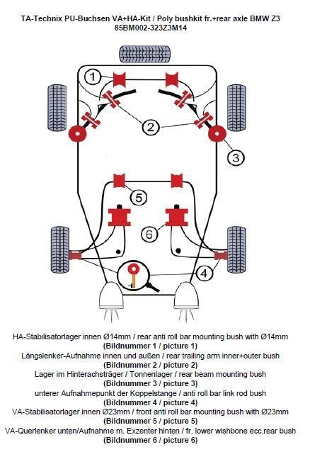 PU-Buchsen Kit Vorder- /Hinterachse 32-teilig Vorderachse Stabilisator Ø 23mm Satz Lager exzentrisch geformt (Bild 6) Hinterachse Stabilisator Ø 14mm beinhaltet: Stabilisatorlager Hinterachse Modelle mit 14mm Ø am Stablisator (Bildnummer 1) Längslenker-Aufnahme innen und außen (Bildnummer 2) Lager im Hinterachsträger / Tonnenlager (Bildnummer 3) Lagerung der Koppelstange am Stabilisator ersetzt das serienmäßige Gummi / Metallager in der Koppelstange / Pendelstütze (Bildnummer 4) Vorderachse-Stabilisatorlager innen Modelle mit Ø 23mm (Bildnummer 5) Vorderachse-Querlenker - Aufnahmepunkt hinten ersetzt das serienmäßige Gummi / Metalllager Satz Lager exzentrisch geformt (Bildnummer 6) passend für BMW Z3 Roadster/Coupe Serie E36 (R/C) ohne M Modelle