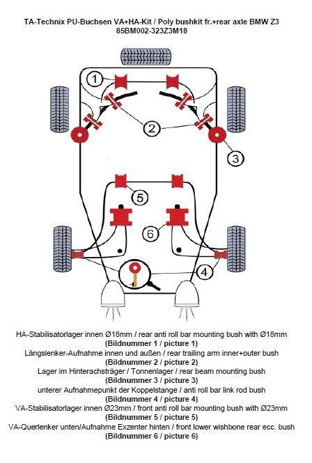 PU-Buchsen Kit Vorder- /Hinterachse 32-teilig Vorderachse Stabilisator Ø 23mm Satz Lager exzentrisch geformt (Bild 6) Hinterachse Stabilisator Ø 18mm beinhaltet: Stabilisatorlager Hinterachse Modelle mit 18mm Ø am Stablisator (Bildnummer 1) Längslenker-Aufnahme innen und außen (Bildnummer 2) Lager im Hinterachsträger / Tonnenlager (Bildnummer 3) Lagerung der Koppelstange am Stabilisator ersetzt das serienmäßige Gummi / Metallager in der Koppelstange / Pendelstütze (Bildnummer 4) Vorderachse-Stabilisatorlager innen Modelle mit Ø 23mm (Bildnummer 5) Vorderachse-Querlenker - Aufnahmepunkt hinten ersetzt das serienmäßige Gummi / Metalllager Satz Lager exzentrisch geformt (Bildnummer 6) passend für BMW Z3 Roadster/Coupe Serie E36 (R/C) ohne M Modelle