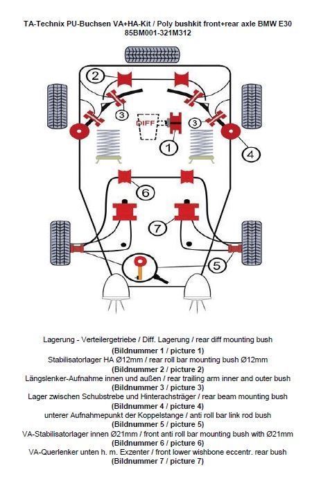 PU-Buchsen Kit Vorder- /Hinterachse 37-teilig Vorderachse Stabilisator Ø 21mm Lager exzentrisch geformt (Bild 7) Hinterachse Stabilisator Ø 12mm beinhaltet: Lagerung - Verteilergetriebe Getriebedeckel / Differentiallagerung ersetzt das serienmäßige Gummi / - Metallager ( Bildnummer 1) Stabilisatorlager Hinterachse Modelle mit 12mm Ø am Stabilisator (Bildnummer 2) Längslenker-Aufnahme innen und außen (Bildnummer 3) Austausch der Gummi / - Metalllager zwischen Schubstrebe und Hinterachsträger (Bildnummer 4) Lagerung der Koppelstange am Stabilisator ersetzt das serienmäßige Gummi / Metallager in der Koppelstange / Pendelstütze (Bildnummer 5) Vorderachse-Stabilisatorlager innen Modelle mit Ø 21mm (Bildnummer 6) Exzenter Buchse ersetzt das serienmäßige Gummi / Metalllager (Bildnummer 7) passend für BMW 3er Serie E30 Limousine (3/1) / Touring (3/1) / Cabriolet (3/R)