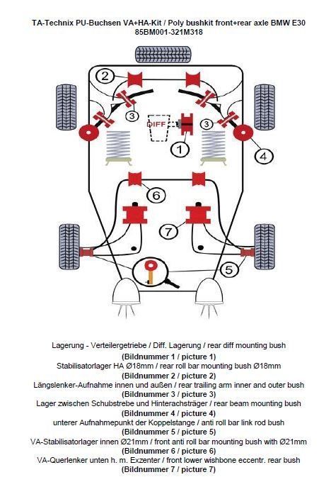 PU-Buchsen Kit Vorder- /Hinterachse 37-teilig Vorderachse Stabilisator Ø 21mm Lager exzentrisch geformt (Bild 7) Hinterachse Stabilisator Ø 18mm beinhaltet: Lagerung - Verteilergetriebe Getriebedeckel / Differentiallagerung ersetzt das serienmäßige Gummi / - Metallager ( Bildnummer 1) Stabilisatorlager Hinterachse Modelle mit 18mm Ø am Stabilisator (Bildnummer 2) Längslenker-Aufnahme innen und außen (Bildnummer 3) Austausch der Gummi / - Metalllager zwischen Schubstrebe und Hinterachsträger (Bildnummer 4) Lagerung der Koppelstange am Stabilisator ersetzt das serienmäßige Gummi / Metallager in der Koppelstange / Pendelstütze (Bildnummer 5) Vorderachse-Stabilisatorlager innen Modelle mit Ø 21mm (Bildnummer 6) Exzenter Buchse ersetzt das serienmäßige Gummi / Metalllager (Bildnummer 7) passend für BMW 3er Serie E30 Limousine (3/1) / Touring (3/1) / Cabriolet (3/R)