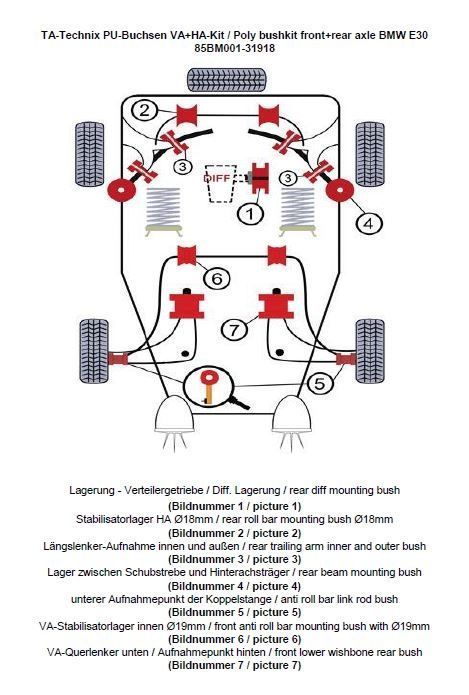 PU-Buchsen Kit Vorder- /Hinterachse 37-teilig Vorderachse Stabilisator Ø 19mm Hinterachse Stabilisator Ø 18mm beinhaltet: Lagerung - Verteilergetriebe Getriebedeckel / Differentiallagerung ersetzt das serienmäßige Gummi / - Metallager ( Bildnummer 1) Stabilisatorlager Hinterachse Modelle mit 18mm Ø am Stabilisator (Bildnummer 2) Längslenker-Aufnahme innen und außen (Bildnummer 3) Austausch der Gummi / - Metalllager zwischen Schubstrebe und Hinterachsträger (Bildnummer 4) Lagerung der Koppelstange am Stabilisator ersetzt das serienmäßige Gummi / Metallager in der Koppelstange / Pendelstütze (Bildnummer 5) Vorderachse-Stabilisatorlager innen Modelle mit Ø 19mm (Bildnummer 6) Vorderachse-Querlenker - Aufnahmepunkt hinten ersetzt das serienmäßige Gummi / Metalllager (Bildnummer 7) passend für BMW 3er Serie E30 Limousine (3/1) / Touring (3/1) / Cabriolet (3/R) Hinterachse = z. B. Modelle mit Sport Stabilisatoren die nachgerüstet wurden