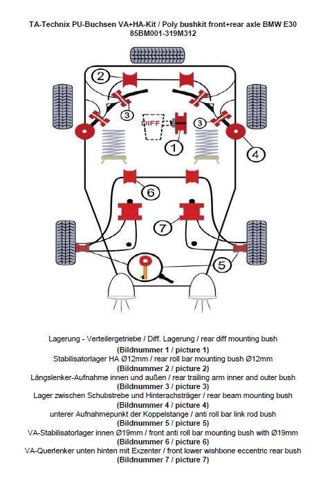 PU-Buchsen Kit Vorder- /Hinterachse 37-teilig Vorderachse Stabilisator Ø 19mm Satz Lager exzentrisch geformt (Bild 7) Hinterachse Stabilisator Ø 12mm beinhaltet: Lagerung - Verteilergetriebe Getriebedeckel / Differentiallagerung ersetzt das serienmäßige Gummi / - Metallager ( Bildnummer 1) Stabilisatorlager Hinterachse Modelle mit 12mm Ø am Stabilisator (Bildnummer 2) Längslenker-Aufnahme innen und außen (Bildnummer 3) Austausch der Gummi / - Metalllager zwischen Schubstrebe und Hinterachsträger (Bildnummer 4) Lagerung der Koppelstange am Stabilisator ersetzt das serienmäßige Gummi / Metallager in der Koppelstange / Pendelstütze (Bildnummer 5) Vorderachse-Stabilisatorlager innen Modelle mit Ø 19mm (Bildnummer 6) Exzenter Buchse ersetzt das serienmäßige Gummi / Metalllager (Bildnummer 7) passend für BMW 3er Serie E30 Limousine (3/1) / Touring (3/1) / Cabriolet (3/R)