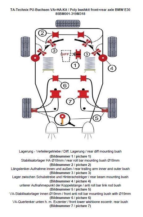 PU-Buchsen Kit Vorder- /Hinterachse 37-teilig Vorderachse Stabilisator Ø 19mm Satz Lager exzentrisch geformt (Bild 7) Hinterachse Stabilisator Ø 18mm beinhaltet: Lagerung - Verteilergetriebe Getriebedeckel / Differentiallagerung ersetzt das serienmäßige Gummi / - Metallager ( Bildnummer 1) Stabilisatorlager Hinterachse Modelle mit 18mm Ø am Stabilisator (Bildnummer 2) Längslenker-Aufnahme innen und außen (Bildnummer 3) Austausch der Gummi / - Metalllager zwischen Schubstrebe und Hinterachsträger (Bildnummer 4) Lagerung der Koppelstange am Stabilisator ersetzt das serienmäßige Gummi / Metallager in der Koppelstange / Pendelstütze (Bildnummer 5) Vorderachse-Stabilisatorlager innen Modelle mit Ø 19mm (Bildnummer 6) Exzenter Buchse ersetzt das serienmäßige Gummi / Metalllager (Bildnummer 7) passend für BMW 3er Serie E30 Limousine (3/1) / Touring (3/1) / Cabriolet (3/R)