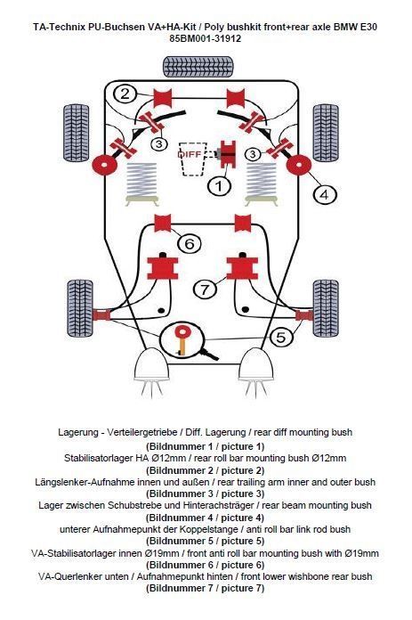 PU-Buchsen Kit Vorder- /Hinterachse 37-teilig Vorderachse Stabilisator Ø 19mm Hinterachse Stabilisator Ø 12mm beinhaltet: Lagerung - Verteilergetriebe Getriebedeckel / Differentiallagerung ersetzt das serienmäßige Gummi / - Metallager (Bildnummer 1) Stabilisatorlager Hinterachse Modelle mit 12mm Ø am Stabilisator (Bildnummer 2) Längslenker-Aufnahme innen und außen (Bildnummer 3) Austausch der Gummi / - Metalllager zwischen Schubstrebe und Hinterachsträger (Bildnummer 4) Lagerung der Koppelstange am Stabilisator ersetzt das serienmäßige Gummi / Metallager in der Koppelstange / Pendelstütze (Bildnummer 5) Vorderachse-Stabilisatorlager innen Modelle mit Ø 19mm (Bildnummer 6) Vorderachse-Querlenker - Aufnahmepunkt hinten ersetzt das serienmäßige Gummi / Metalllager (Bildnummer 7) passend für BMW 3er Serie E30 Limousine (3/1) / Touring (3/1) / Cabriolet (3/R) ohne M3 und iX Modelle