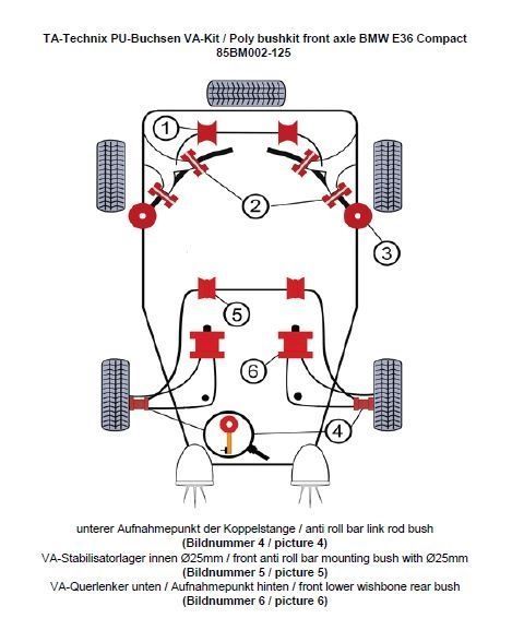 PU-Buchsen Kit Vorderachse 12-teilig Modelle mit Ø 25mm Stabilisator beinhaltet: Lagerung der Koppelstange am Stabilisator ersetzt das serienmäßige Gummi / Metallager in der Koppelstange / Pendelstütze (Bildnummer 5) E36 Compact+Z3 (Bildnummer 4) Vorderachse-Stabilisatorlager innen Modelle mit Ø 25mm (Bildnummer 6) E36 Compact+Z3 (Bildnummer 5) Vorderachse-Querlenker - Aufnahmepunkt hinten ersetzt das serienmäßige Gummi / Metalllager (Bildnummer 7) E36 Compact+Z3 (Bildnummer 6) passend für BMW 3er Serie E36 Compact (3CG) BMW 3er Serie E36 (3C,3B,3/C,3/B) Coupe / Limousine / Touring / Cabriolet ohne M3 Modelle BMW Z3 Roadster/Coupe (R/C) ohne M Modelle