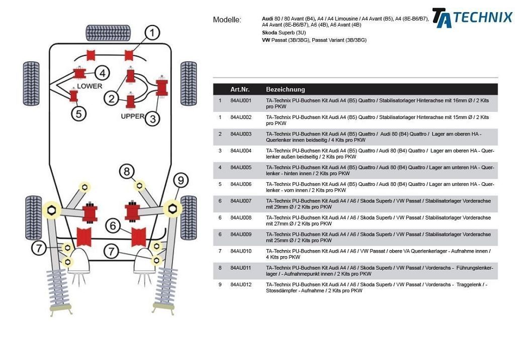 PU-Buchsen Stabilisatorlager Hinterachse Modelle mit Ø 16mm Stablisator passend für Audi 80 (8C,B4) Quattro inkl. S2/RS2 Audi A4 (8D,B5) Quattro inkl. S4 / RS4 Audi A4 (8E,B6+B7) Quattro Audi A4 Cabriolet (8H,B6+B7) Quattro Audi A6 (4B,C5) Quattro Audi A6 Allroad (4BH,C5) VW Passat 3B (3B) Syncro/4-motion siehe Abb. in Einbauposition (PDF): Audi A4 (B5) Quattro inkl. S4 / RS4 ( Bildnummer 1)