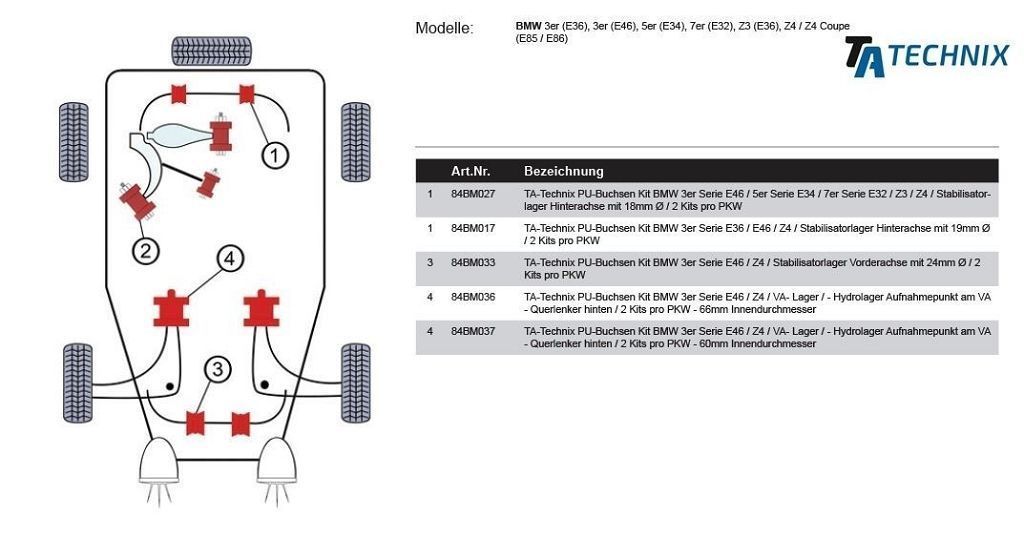 - Typ 3er (E36), 3er (E46), 5er (E34), Z4 (E85+E86)