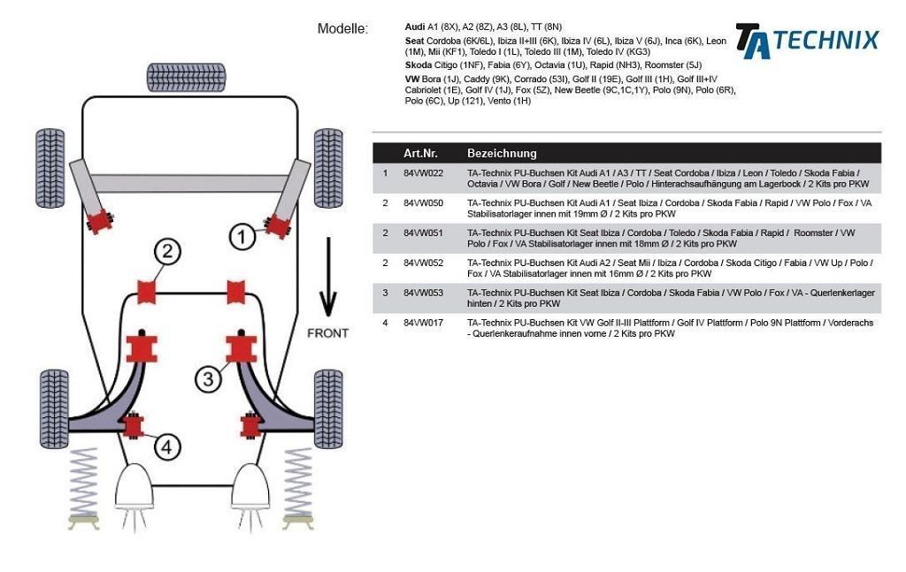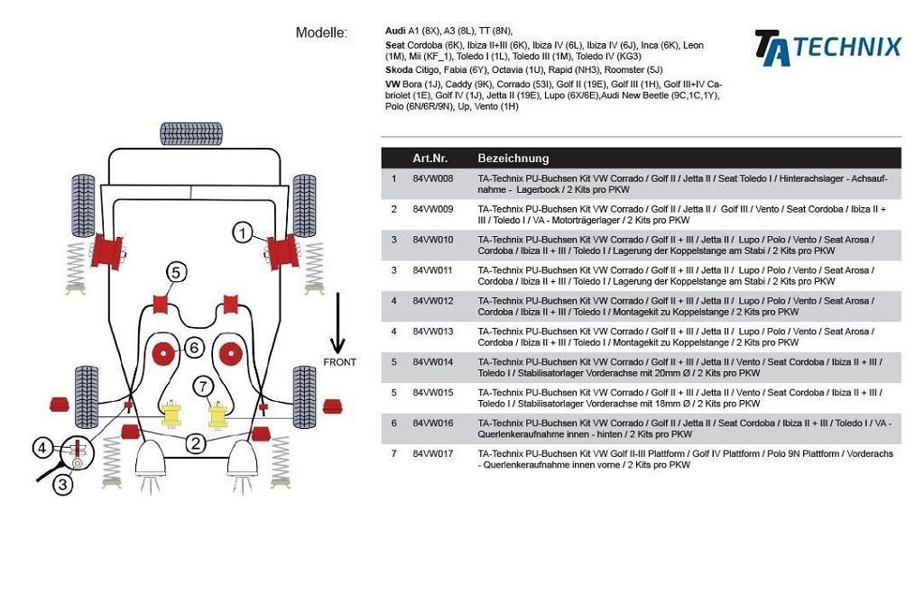 PU-Buchsen Vorderachs - Querlenkeraufnahme innen vorne ersetzt das serienmäßige Gummilager / - Metallager Modelle mit Stahlblech - Querlenker passend für Audi A1 (8X) Audi A3 (8L) Audi TT (8N) Seat Cordoba (6K) Seat Ibiza II - V (6K/6L/6J) Seat Inca (6K) Seat Leon (1M) SEat Mii (KF_1) Seat Toledo I + III + IV (1L/1M/KG3) Skoda Citigo Skoda Fabia (6Y) Skoda Octavia (1U) Skoda Rapid (NH3) Skoda Roomster (5J) VW Bora (1J) VW Caddy (9K) VW Corrado (53I) VW Golf II (19E) VW Golf III (1H) VW Golf III + IV Cabriolet (1E) VW Jetta II (19E) VW New Beetle inkl. Cabrio (9C/1C/1Y) VW Polo (9N) VW Polo (6R) VW Golf IV (1J) VW Up VW Vento (1H) siehe Abb. in Einbauposition (PDF): VW Vento /Jetta II / Golf II+III / Corrado ( Bildnummer 7) VW Polo 9N 2002-2005 ( Bildnummer 4) VW Golf IV / New Beetle ( Bildnummer 8) VW Golf II G60 Rallye / Golf IV 4 motion (Bildnummer 10)